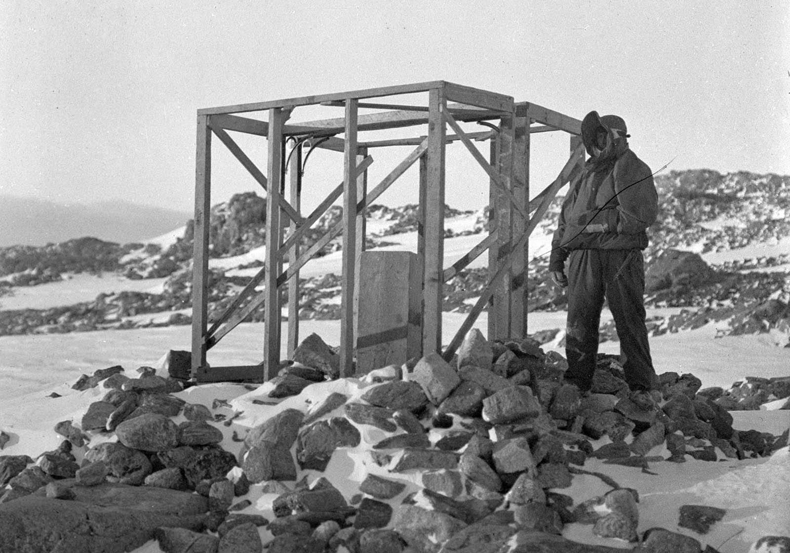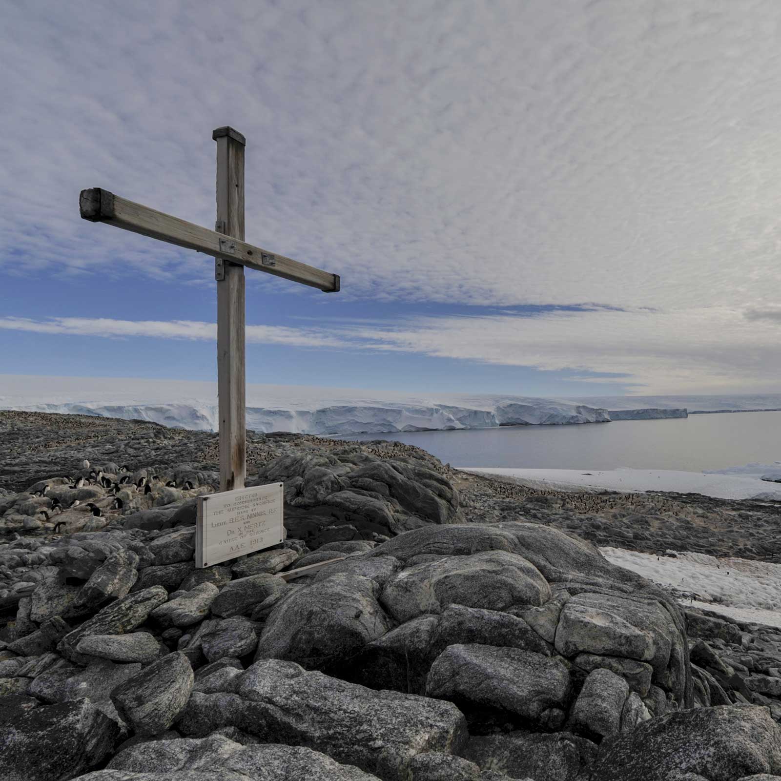 The Memorial Cross was erected in November 1913 in memory of Belgrave Ninnis and Xavier Mertz, the AAE members who perished during the notorious 1912-13 sledging journey that Mawson himself barely survived.