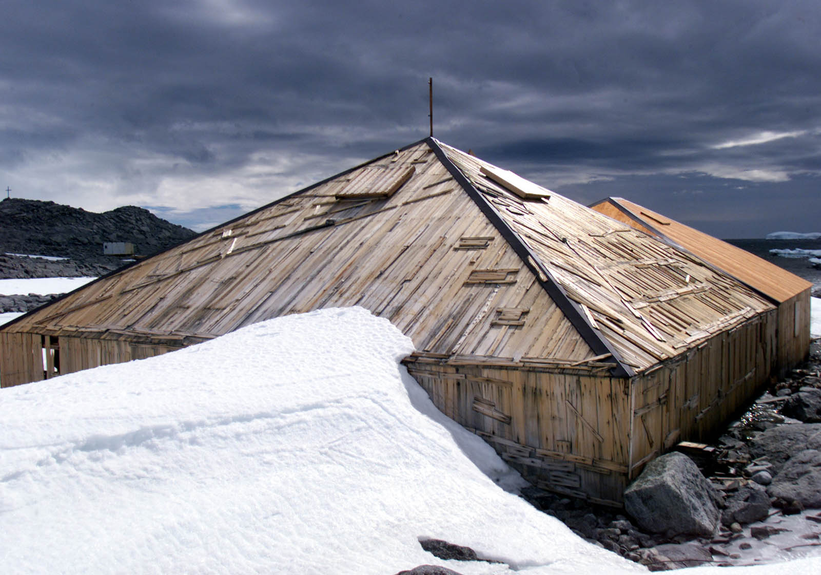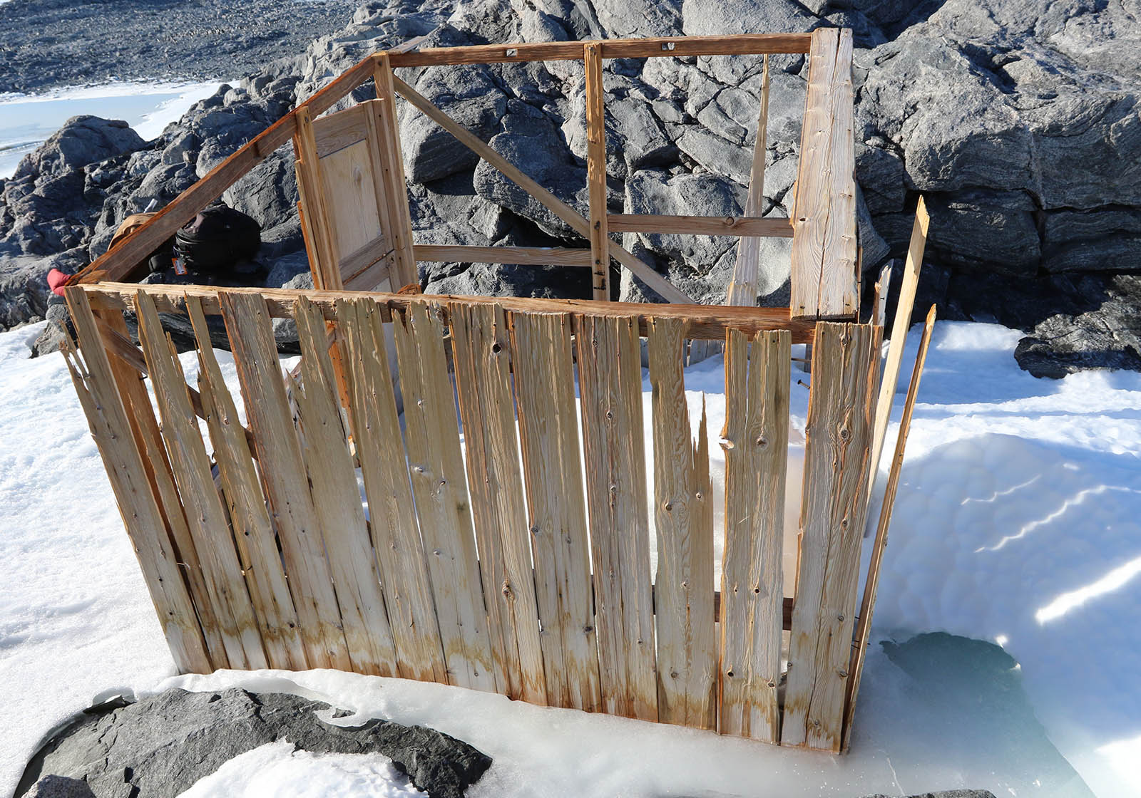 Timber uprights were placed in holes blasted in bedrock, and held in place with rock and ice, before being joined to form a frame and clad with Baltic pine boards. They provide a living hut with a workshop leading off it. The entire structure is still complete but largely ice-filled. The frame building is clad in tongue and grooved baltic pine boards with little or no insulation material added.