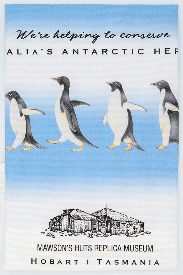 Tea-Towel manufactured in Tasmania by W. Garrett & Co. "Adelie Penguins & Mawson’s Huts Replica Museum"